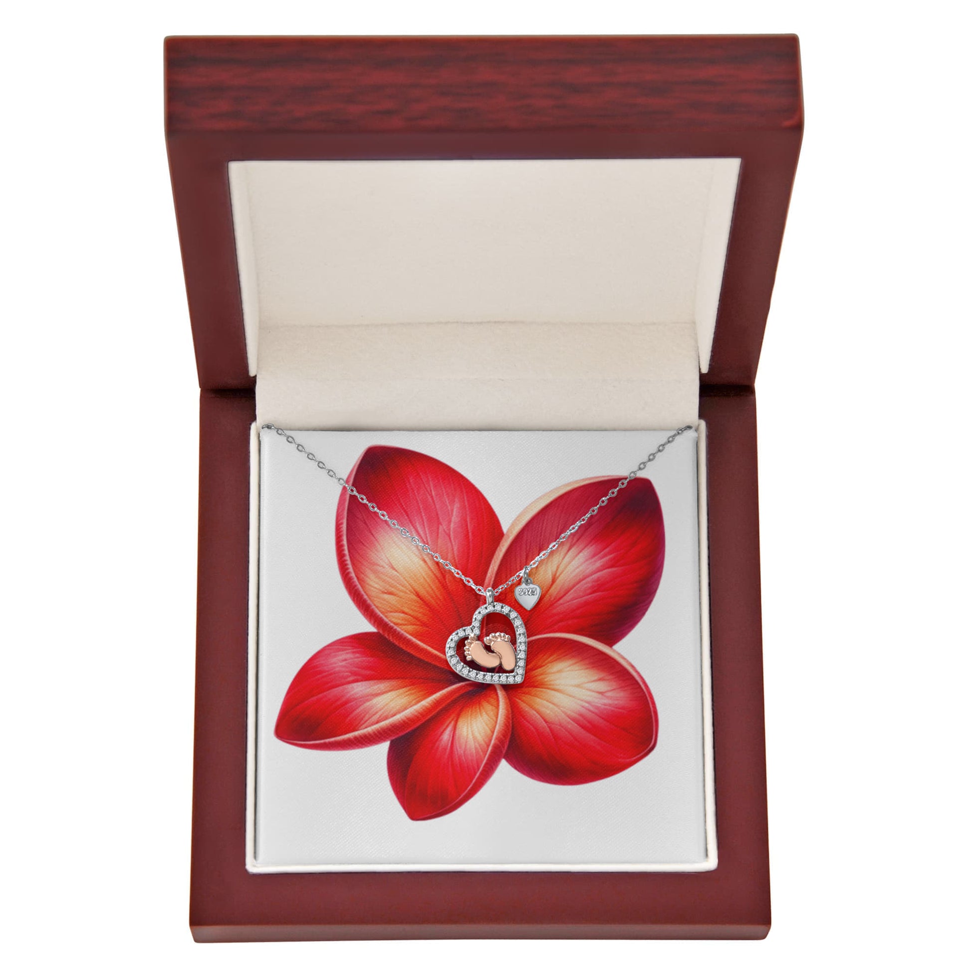 Imagine her reaction receiving this heartfelt symbol of love, family, and precious beginnings. The Baby Feet Heart Necklace features a sparkling heart-shaped frame adorned with shimmering cubic zirconia, surrounding a delicate pair of rose gold baby feet. A touching tribute to motherhood and new life, this necklace is the perfect way to celebrate a new mom, a cherished child, or a growing family.
